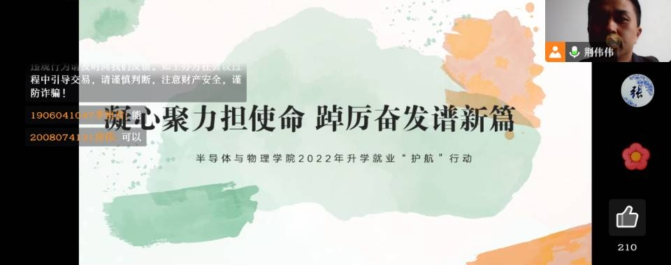 2022年升学就业“护航行动”在线上召开。唐军、梁庭、闫仕农、李辉、姚大悦、安琪、冯旖、李美溪、崔志栋参加了会议,会议由荆伟伟老师主持。