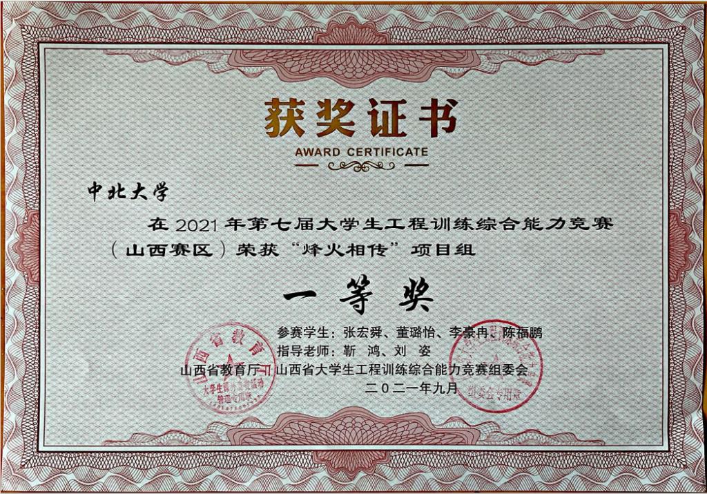2021年,获第七届大学生工程综合能力竞赛(山西赛区)获“烽火相传”项目组省级一等奖。