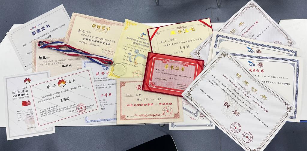 在竞赛中,荣获三项国家级、六项省级、十余项校级奖项与若干院级奖项;并拥有软件著作权一份。