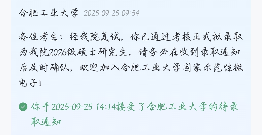 收到合肥工业大学推免拟录取通知时,我在图书馆热泪盈眶。回望大学,我无耀眼的科研竞赛成绩,却靠 “打牢基础、稳步前行” 走到现在。我想证明,平凡起点也能追逐优秀。中北教会我专注,合工大将是新征程。