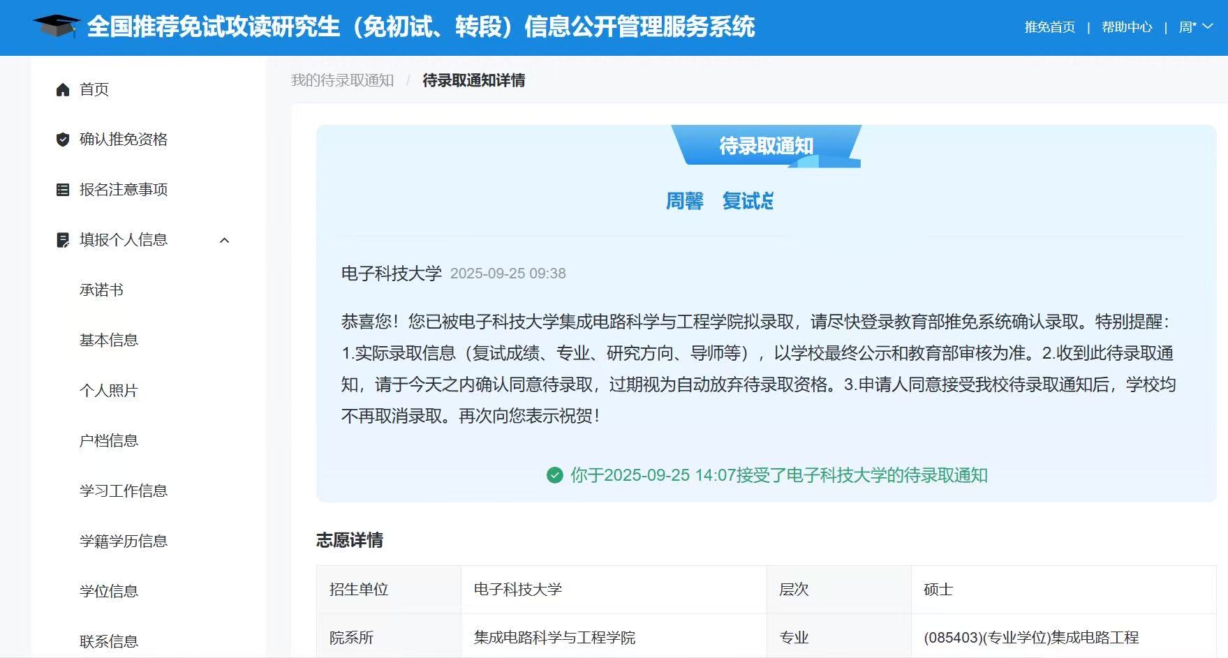 在推免夏令营期间,我在七月中旬参加电子科技大学的考核,顺利通过面试,学有所用,梦有所偿。此刻回望,从清晨图书馆的晨光到深夜照亮书本的微光,从学校实验室的钻研到面试现场的从容,保研路上的星光,是无数挑灯夜读的坚守点亮的,这份成果是过往耕耘的勋章,更是我学术科研新程的序章。大学生活是一场精彩的演出,大四,我想,我们将带着对母校深深的依恋,热爱生活,倒数着与性爱片