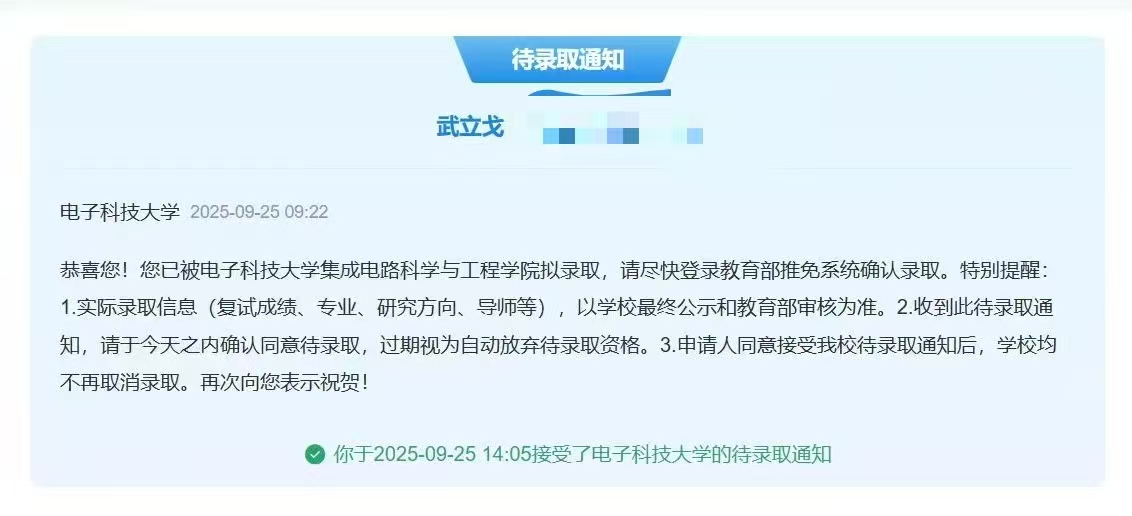 在大三夏令营与预推免期间,我先后参加了山东大学、中国科学院微电子所、北京航空航天大学、电子科技大学的面试,每一场面试都是一次自我审视与提升,我认真梳理专业知识、复盘竞赛经历,在与导师的交流中明晰方向。最终,我如愿拿到了电子科技大学的录取通知,为三年的逐梦之旅画上了圆满的句号。
