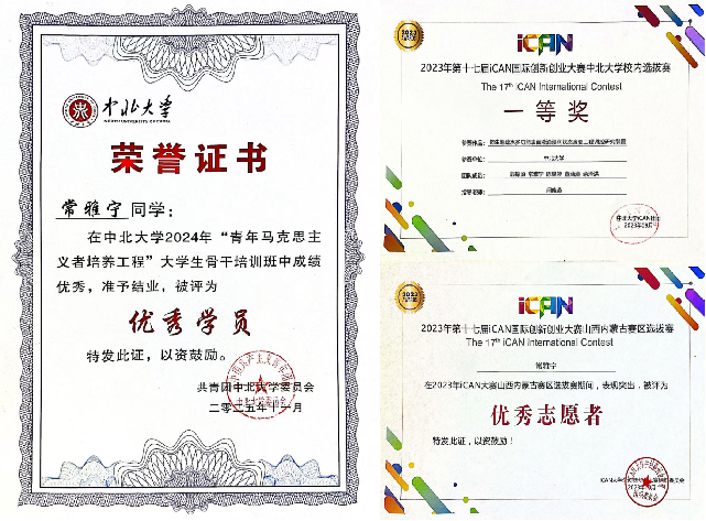 “青年马克思主义者培养工程”大学生骨干培养班“优秀学员”等荣誉称号,曾获国家励志奖学金,综合素质一等奖学金等多项奖学金。