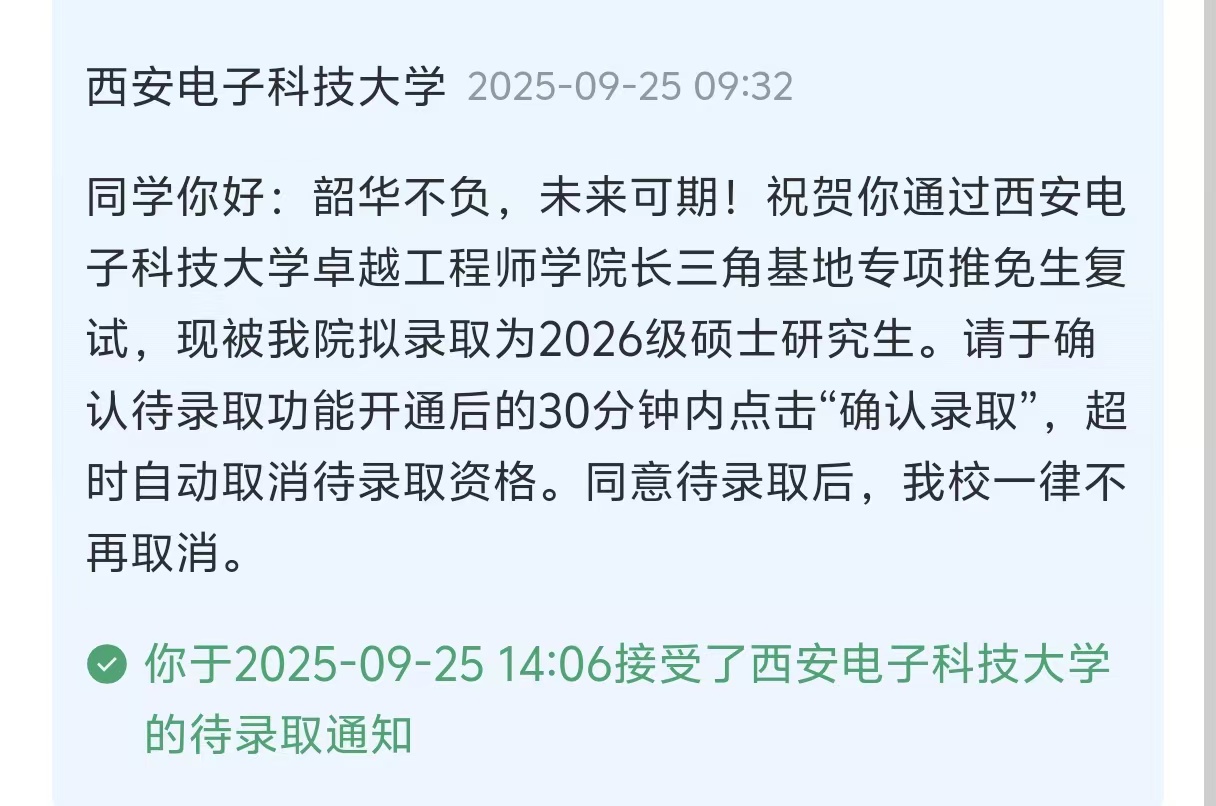 大一下学期,有幸遇到了一群志同道合的伙伴,开始接触竞赛。偶然得知了转专业的消息,又第一次听说了保研的事情。冥冥之中有一种感觉,我的机会来了。成功转专业后,迎来的是上不完的课和连续的考试,但我明白“梅花香自苦寒来”,保研的路一定不会那样容易走,但回望过去,也没有想象中的艰辛。三年转瞬即逝,保研也落下了帷幕,十分庆幸自己没有放弃,最终如愿以偿。