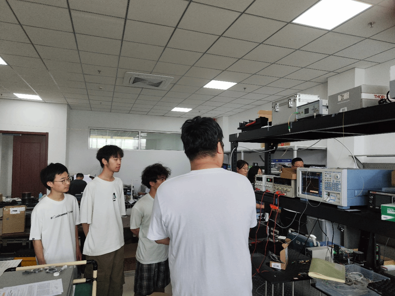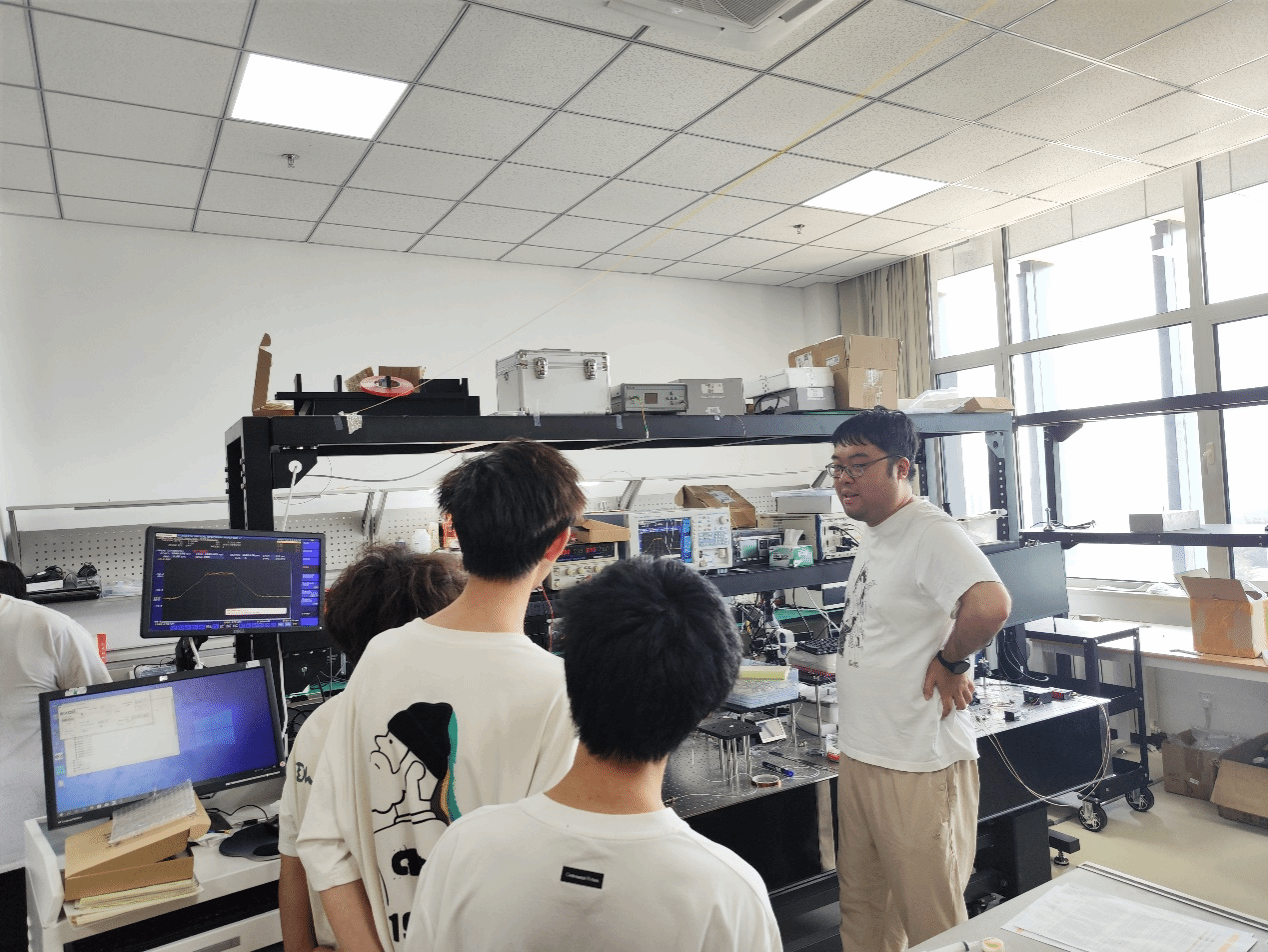 在实验室里,整齐的光学平台、精密的激光器、光谱仪、CCD探测系统、干涉装置等科研设备映入眼帘。杨根森导师详细介绍了实验室的主要研究方向,包括超构表面设计与制备、光谱调控技术、蓝宝石光学特性测量等,并结合正在进行的科研项目,讲解了如何利用实验平台开展材料折射率测量、光束调控及光学器件性能评估。学生们专注地聆听讲解,并在导师指导下近距离观察了部分实验装置的运行过程,对光学实验的科学性与严谨性有了直观的认识。参观过程中,导师多次强调实验室安全的重要性。从佩戴防护眼镜、防止激光直射,到掌握仪器正确开关顺序、妥善保存实验数据,每一个细节都事关实验顺利与人员安全。他指出,科研能力的培养不仅在于技术水平,更在于形成严谨细致的工作态度,这种素养应当在大学学习伊始便加以养成。