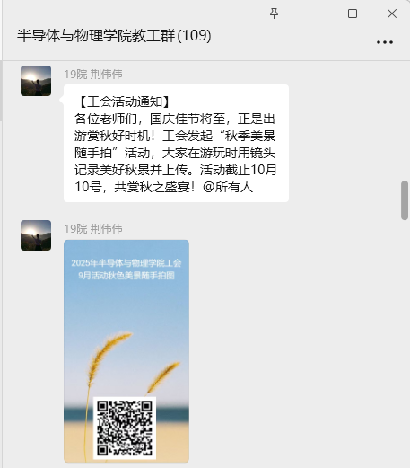 工会于2025年9月28日启动“秋季美景随手拍”摄影活动,邀请全院教职工在国庆黄金周期间,用镜头捕捉祖国大地绚烂秋色,共享秋之盛宴。活动一经发出便得到热烈响应,短短三天,工会邮箱已收到近百幅投稿:银杏掩映的校园晨读、校园内的金黄柿子树、汾河老龙头景区的音乐喷泉、最美迎泽大街打卡夜景……一幅幅鲜活画面,既展现了祖国南北壮美的生态画卷,也折射出教职工发现美、记录美、传递美的生活态度。