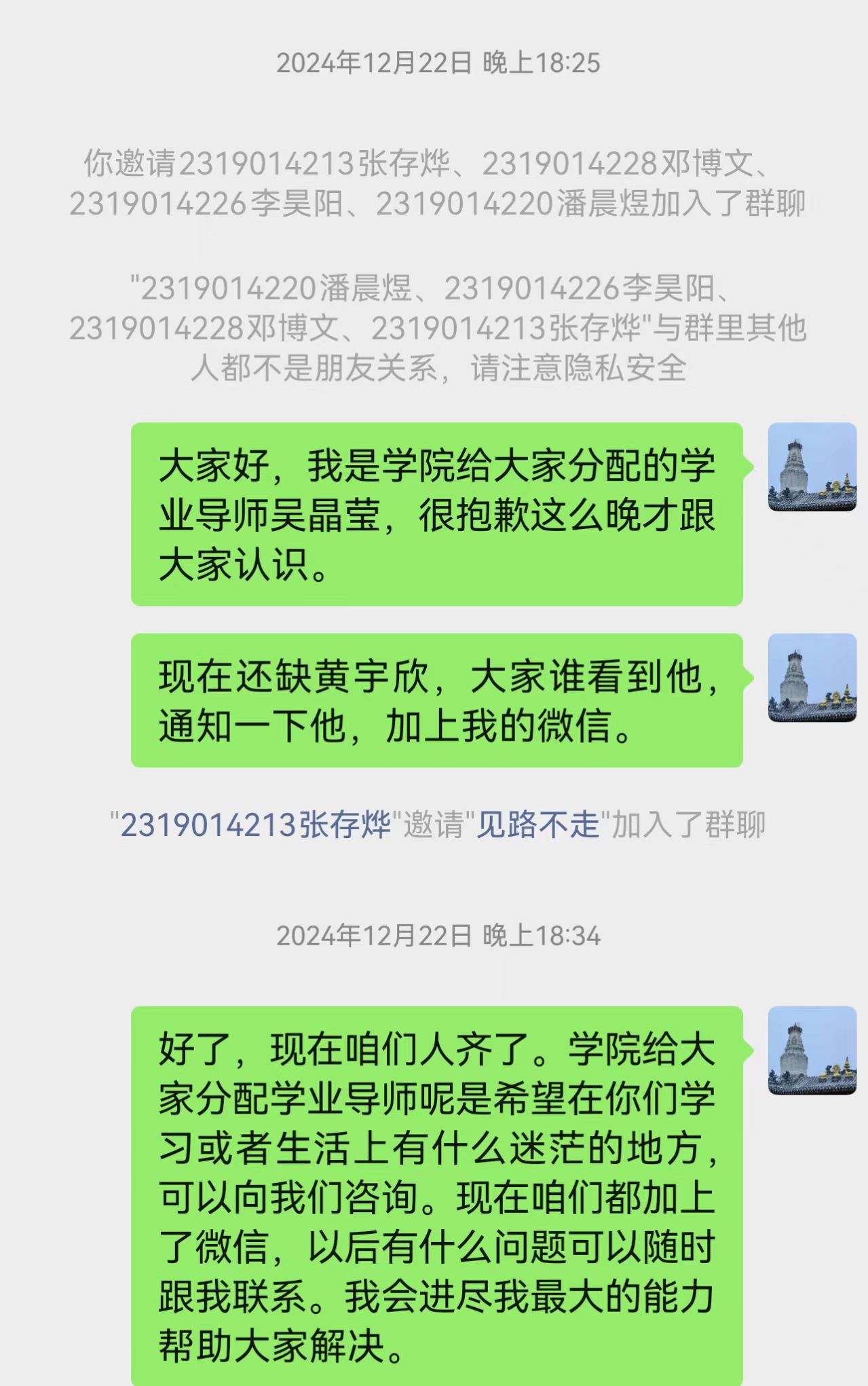 为深入推进“三全育人”工作,加强学业导师与学生之间的沟通联系,吴晶莹老师于2024年12月 21日通过微信线上平台与24 级的4名同学同学开展了“三全育人学业导师系列活动”首次线上见面会。本次活动以“云端启航·共育未来”为主题,开启了一场别开生面的线上交流。