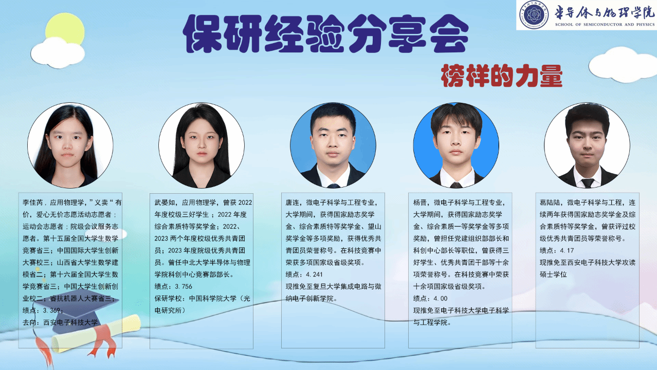 本次分享会立足学生实际需求,特邀李佳芮、武晏如、唐连、杨晋、葛陆陆五位成功保研至知名高校的优秀学长学姐担任主讲嘉宾。分享内容涵盖保研全过程,从科研项目参与、院校选择策略、材料准备要点,到专业课学习方法、英语备考技巧、时间管理策略等核心环节。嘉宾们不仅系统梳理了保研时间节点和关键任务,还结合自身经历,分享了如何在大学期间规划学业、参与科研、提升综合竞争力的实用建议。